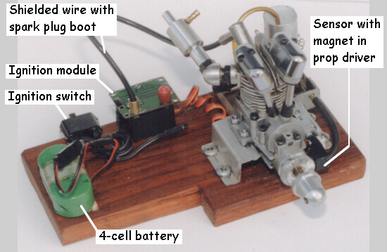 Figure 3 shows what is standard for a single-cylinder engine: an ignition module (with the non-working output shorted), a shielded cable with a spark plug boot, a sensor plugged into one end of the module, a small magnet in the prop driver, a power supply with a switch plugged into the other end of the module. That’s all!